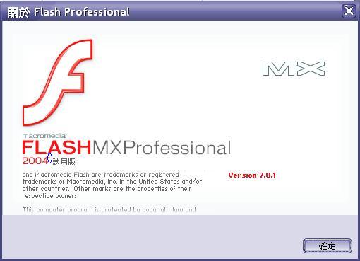 啟動 Flash ,在功能表依序點『說明』『關於 Flash Professional』,出現「關於 Flash Professional 」對話盒後,在標題「FlashMXProfessional 2004」的「2004」的右上方有個小小的「R」,在上面按一下滑鼠左鍵。