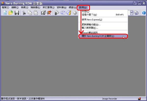 開啟 Nero Bunring ROM 後,在功能表中按下『說明』『關於 Nero Burning ROM』。