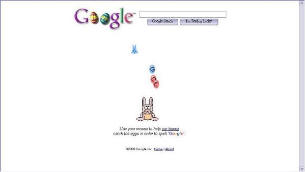 連進「http://www.google.com/Easter/feature_easter.html」這個頁面,接著空終究會不斷掉落 Google 字母的彩蛋,趕快用滑鼠移動拿的籃子的兔子去接彩蛋吧!