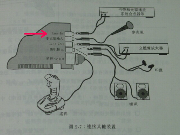 這是音效卡後方插孔的說明,我們要接的就是箭頭所指的 Line in 訊號輸入端。