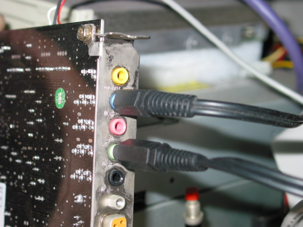 將訊號線另一端接上音效卡輸入端(如果是接耳機孔,訊號線兩端都一樣,哪一端接音效卡都可以)。