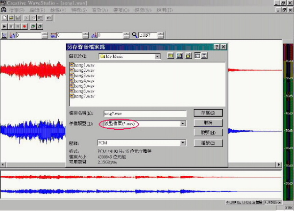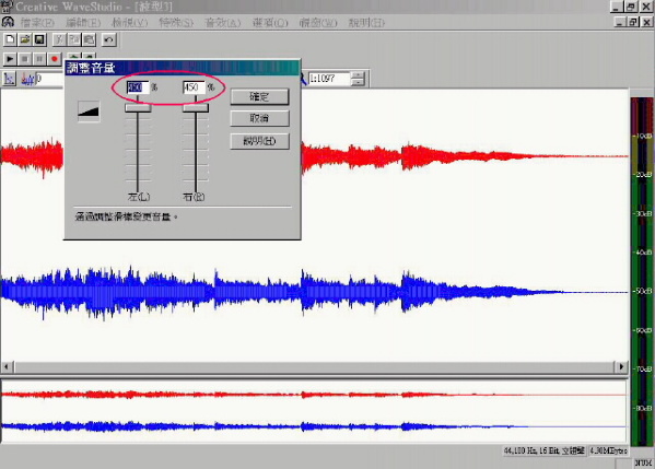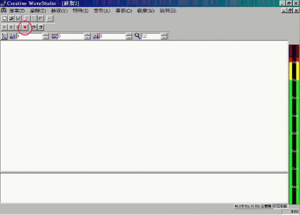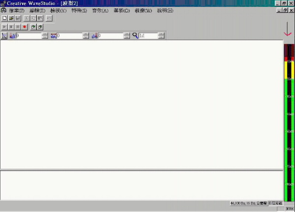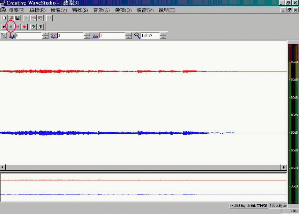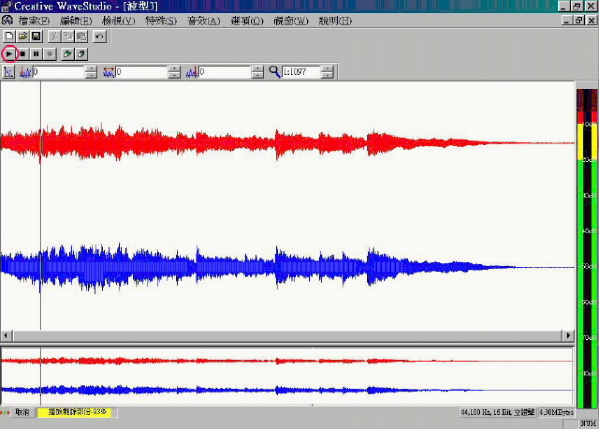 線已經接好了,接下來就是開啟錄音軟體,此是用 Creative 音效卡附的 Wave Studio 錄音軟體做說明,先撥放錄音帶,如果訊號有進來右邊這兩條會上下跳動。