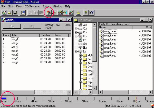 以上都沒問題就可以開始錄了,按下紅色按鈕就開始錄,這裡有個重點一定要講,假如你是錄歌曲應該就是一首歌錄成一個檔案,如果是錄別的例如英語教材那就不一定了,因為每一個檔案去燒成音樂光碟的時候都代表一個音軌,也就是說假設你錄了 20 個檔案,燒出來會有 20 個音軌,你放到 CD 撥放機或 CD 音響時會顯示 "20",它認為這片 CD 裡有 20 個段落,這樣就方便你去選要聽哪一故事或哪一個單元,如果你把 20 個故事只錄成一個檔案,燒出來只有一個音軌,你在音響聽的時候就沒得挑了,一定要從頭聽到尾或是用快轉的方式,也沒辦法針對哪一段做 Repeat (重複撥放),很不方便,所以如果你會利用這層關係會比錄音帶方便很多,絕不光是保存時間長的優點而已。